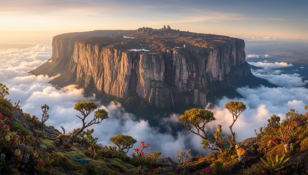 A majestic tabletop mountain featuring stunning sheer cliffs, unique endemic wildlife, and regarded as sacred land by the Pemon people.
