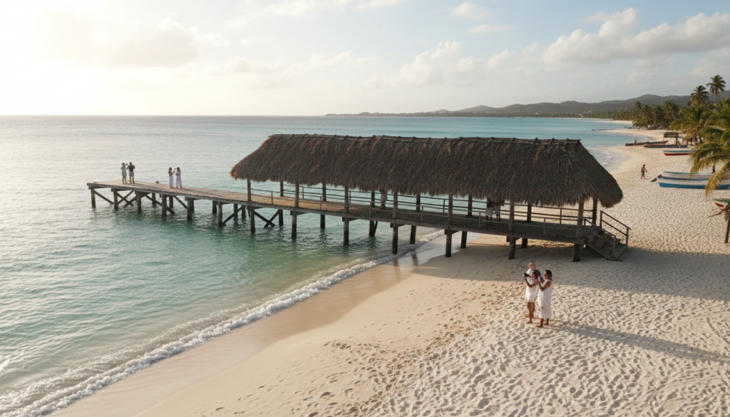 This beach is famous for its dazzling sands and pristine waters. It also features a traditional thatched jetty, perfect for reaching the beach and capturing a picture-perfect moment by the sea.